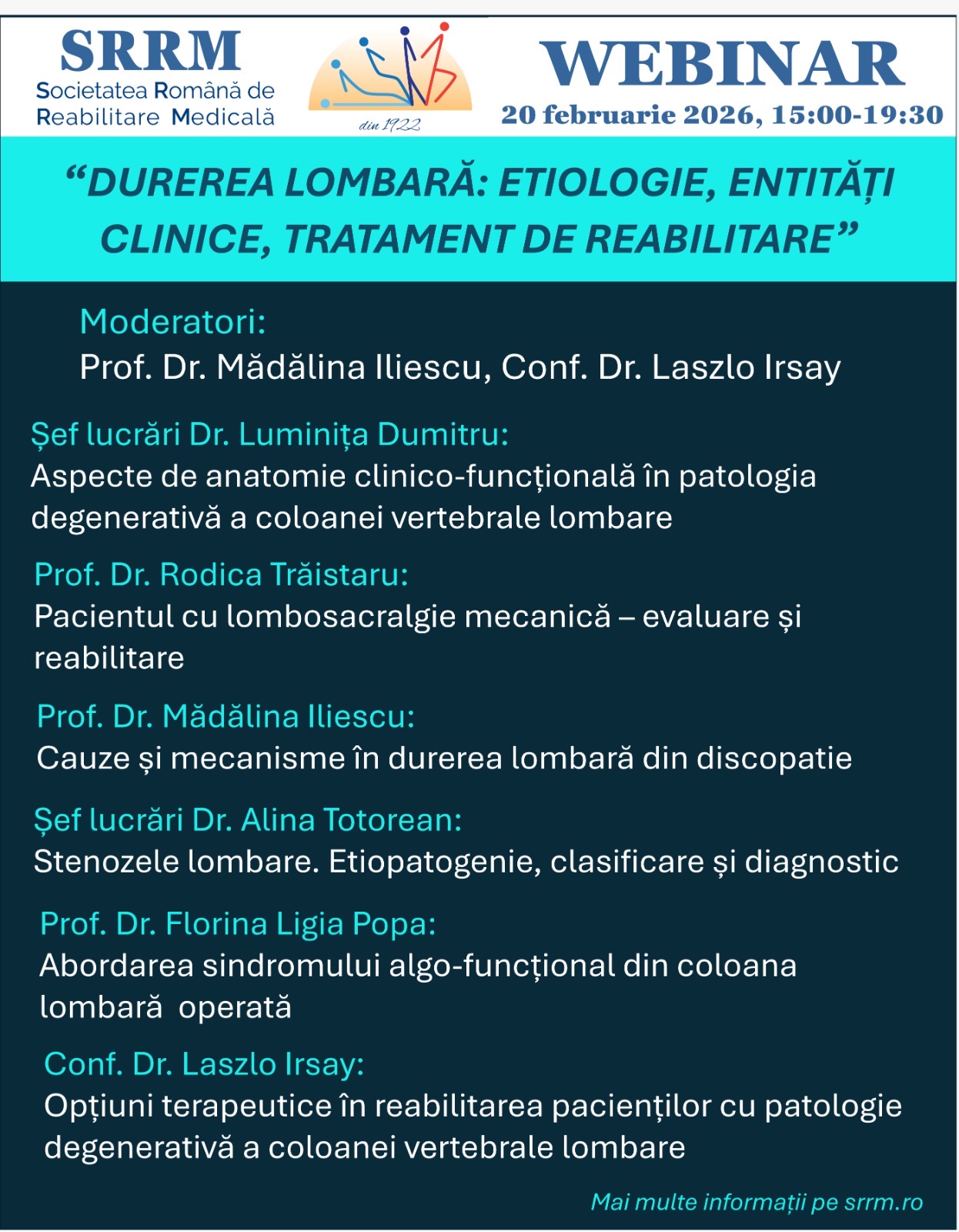 Cursul va aborda principalele cauze ale durerii lombare, corelarea clinică și imagistică, precum și strategiile moderne de reabilitare medicală.